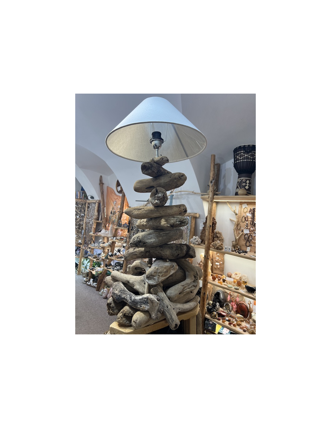 Každý kus dřeva je originální svým tvarem a tak lampa není nikdy stejná, každý kus je jinak poskládán. Vrchní klobouk je ve světlé barvě. Kabel je umístěn mezi dřevem, aby nijak neplandal.