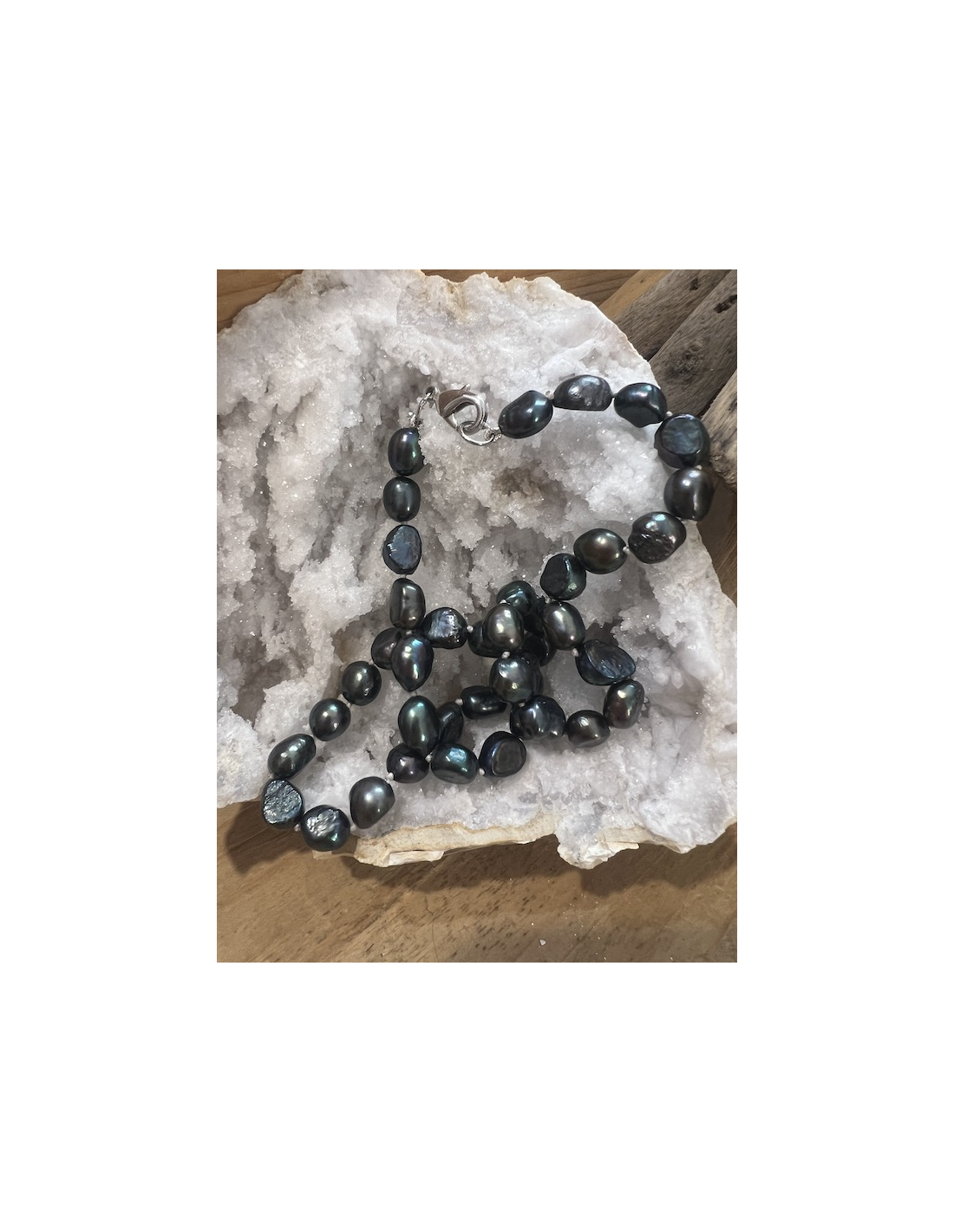 Náhrdelník je vyrobený z nepravidelných sladkovodních perel. Perly jsou navlečeny na hedvábné šňůrce, mezi jednotlivými perlami jsou uzlíky, aby se perly neodíraly. Délka náhrdelníku je 45 cm.