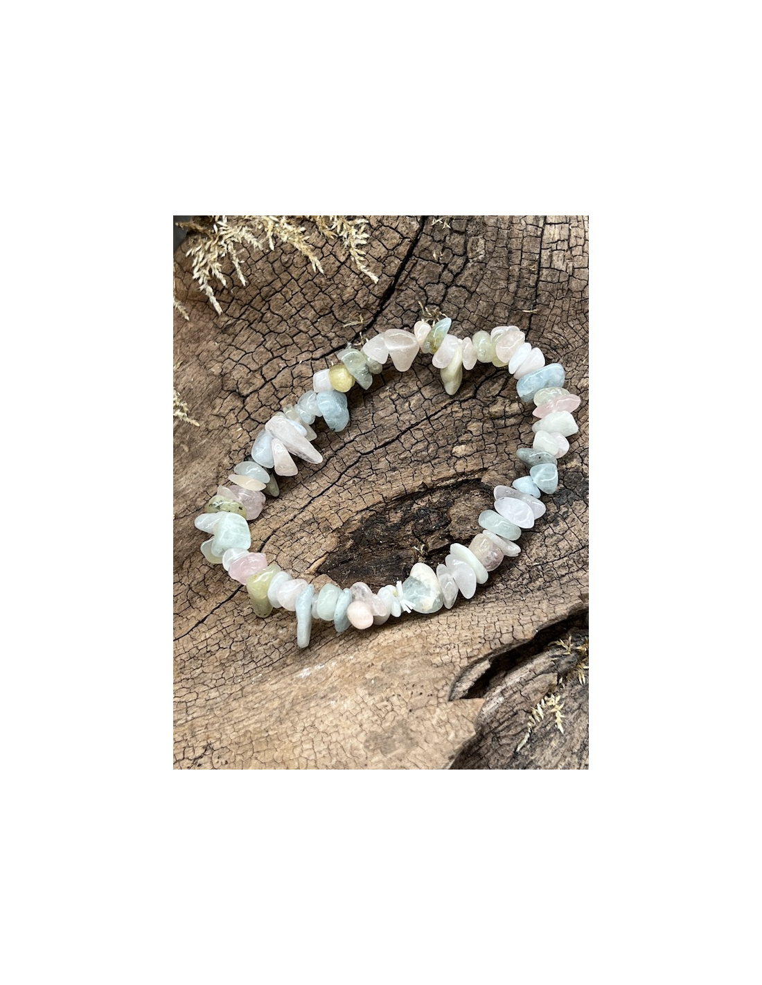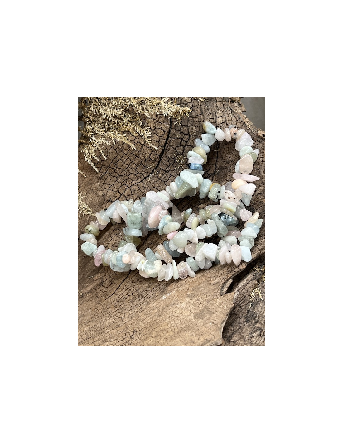 Kompletováno: Morganit nepravidelného tvaru cca 6 - 10 mm, elastická gumička.