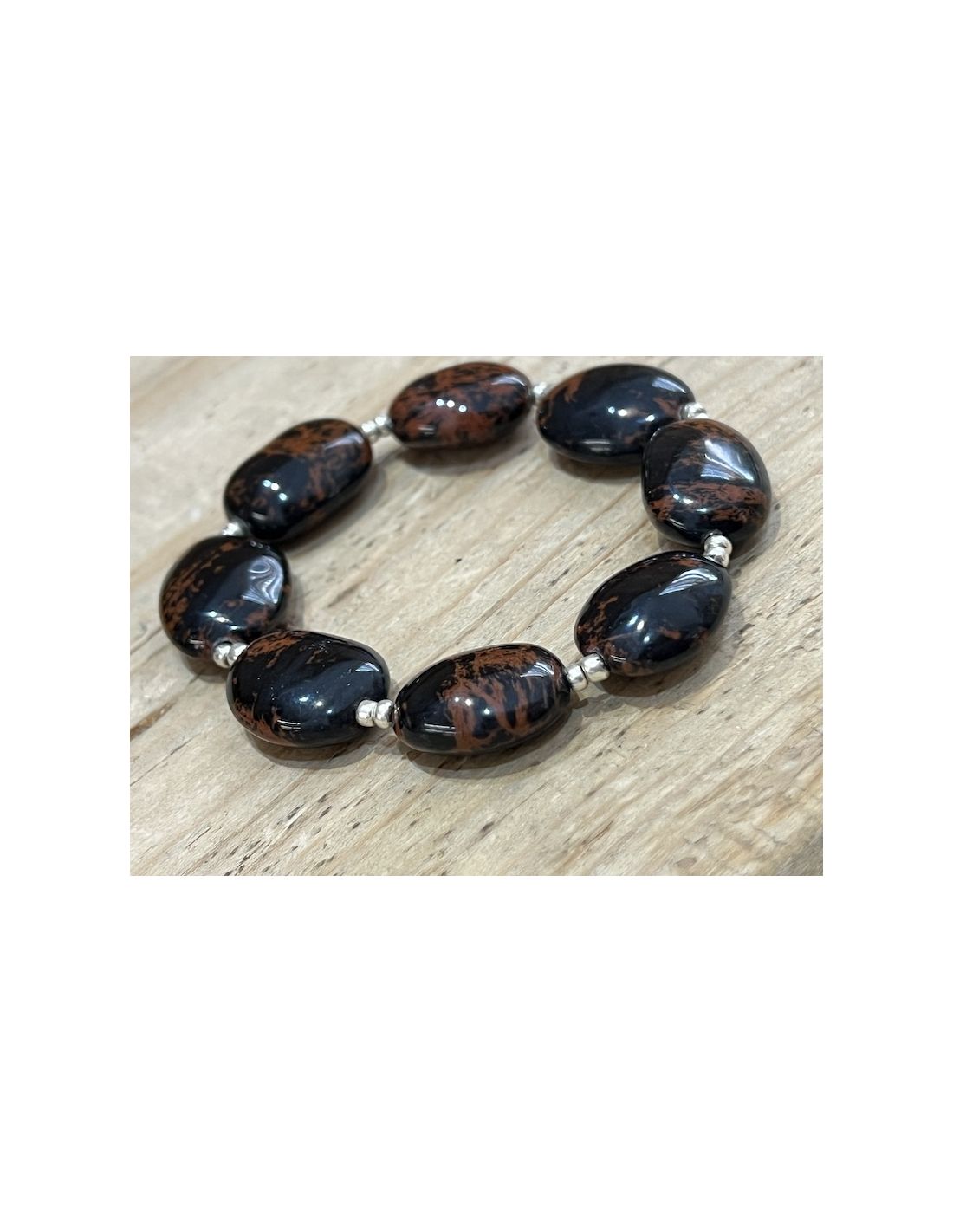 Mahagonový obsidián - působí jemněji než černý. Rezonuje se zemí, chrání a dodává sílu. Oživuje stanovené cíle, odstraňuje energetické bloky. Posiluje slabou auru a navrací správnou rotaci duchovní čakře stejně jako čakře solar plexu. Nošený na těle přináší úlevu. Pomáhá pravdě, účinkuje velmi rychle a s obrovskou silou, odráží jednotlivé lidské vlastnosti odhaluje trhliny, slabosti a bloky. Před obsidiánem nelze nic zatajit. Tím, že umí nabídnout způsob, jak se zbavit všech destruktivních a oslabujících vlastností, nás obsidián podněcuje k dalšímu růstu a během celého procesu nám poskytuje stabilní podporu. Umožňuje důkladné a do hloubky jdoucí léčení duše. Pomáhá při cestách do minulých životů. S obsidiánem je třeba pracovat velmi opatrně, neboť dokáže vynášet na povrch negativní emoce a nepříjemné pravdy.